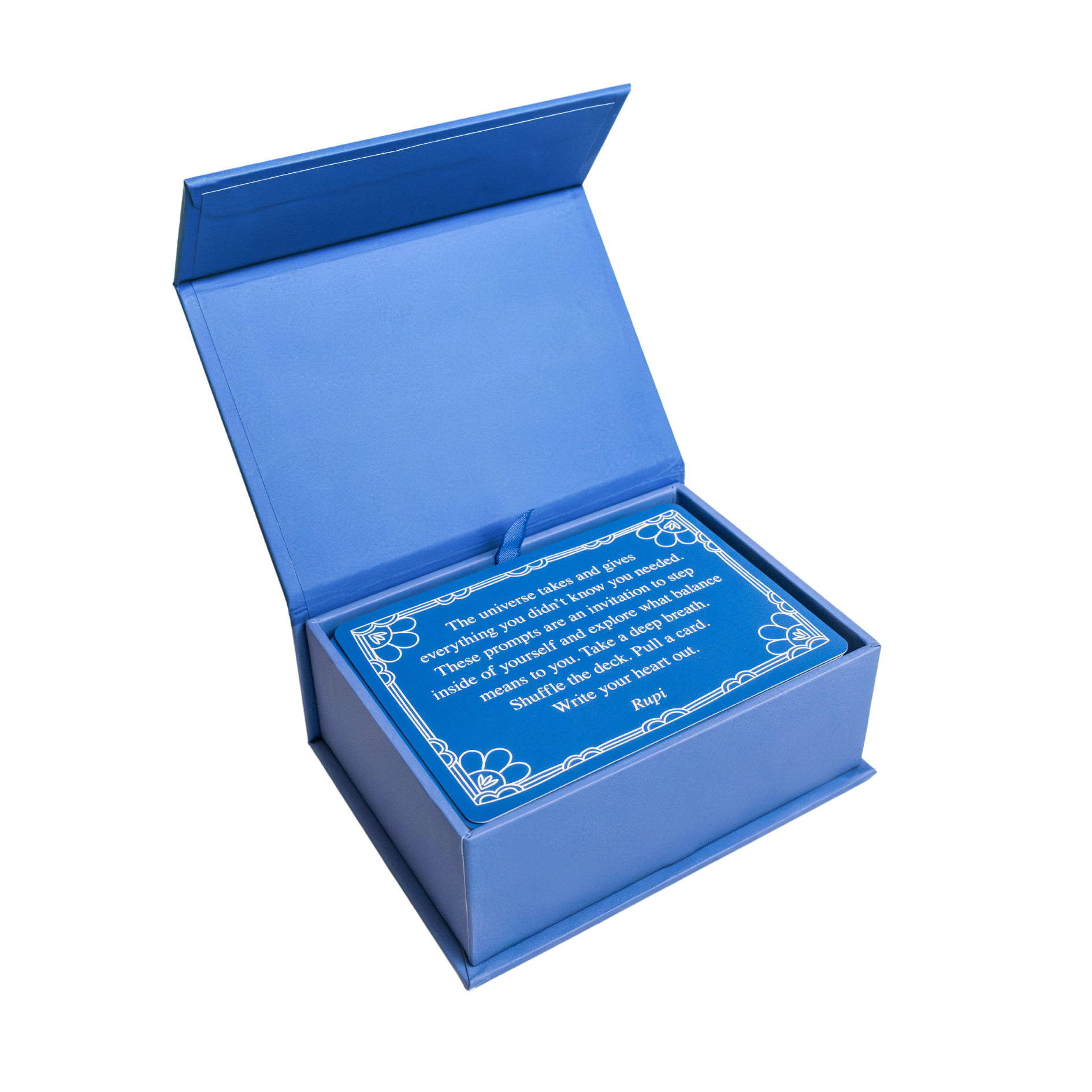 Rupi Kaur invites you to explore the concept of balance in your life with a thoughtfully curated deck of 70 writing prompts meant to encourage a deeper connection with yourself. While focusing on the theme of balance, use this card deck as a part of your daily ritual to inspire creativity and growth. We hope it becomes a tool for you to continue to discover more about your inner and outer worlds, and a light to help navigate you through it all.