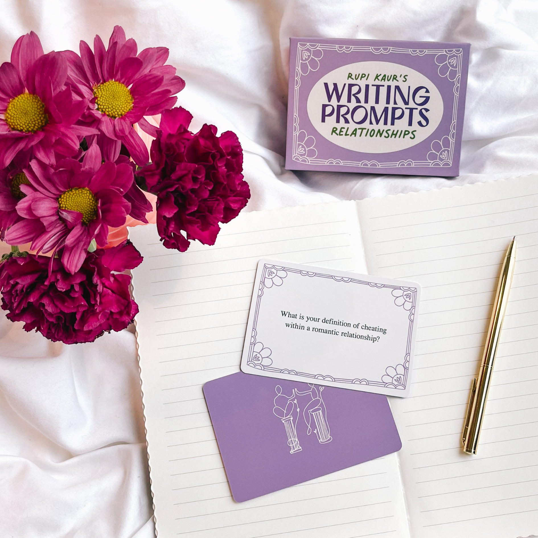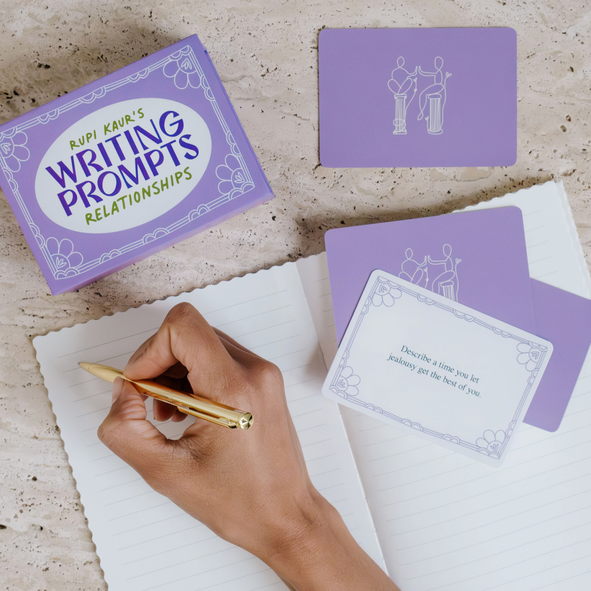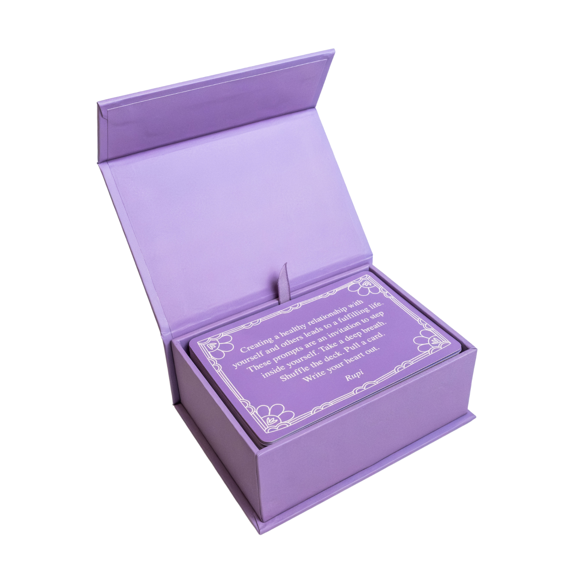 Rupi Kaur encourages you to build more honest and fulfilling relationships with help from this thoughtfully curated deck of 70 writing prompts. While focusing on the theme of relationships, use this card deck as a part of your daily ritual to inspire connection and creativity. We hope it becomes a tool for you to continue discovering more about your inner and outer worlds, and a light to help navigate you through it all.